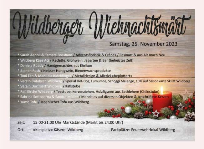 Und am Samstag 30.11.24 findet dann der Wildberger Wiehnachtsmärt statt. Der Dorf Märt Wildberg darf da wieder die Kaffeestube führen und Sie mit hausgemachten Kuchen verwöhnen.