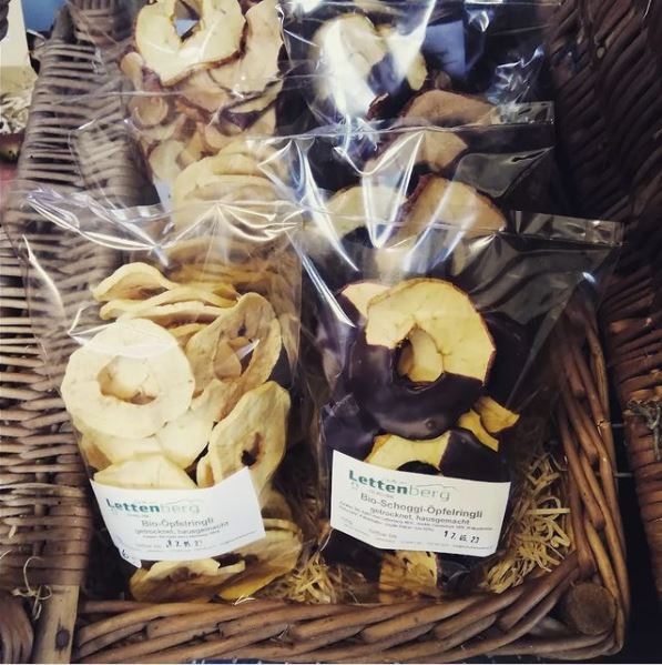 Neu haben wir feine Apfel-Ringli im Dorf Märt. Mit und ohne Schoggi-Füsse. Genau die richtige Zwischenverpflegung für die nächste Wanderung. En Guete!