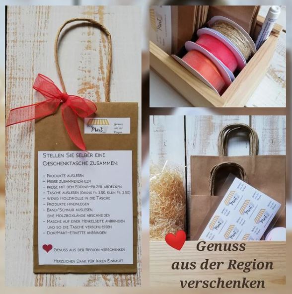 Taschen zum selber befüllen mit Produkten aus unserem grossen Angebot, hat es im Laden, inkl. Bändeli um das "Päckli" gerade fertig stellen zu können. Wir freuen uns zusammen mit all unseren regionalen Produzenten wenn der Dorf Märt für Geschenke berücksichtigt wird.