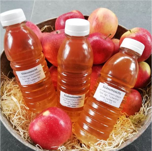 Heute neu eingetroffen: "Süessmoscht" in 5dl Fläschli von Familie Egli aus Turbenthal. Ein super Pausen-Powergetränk.