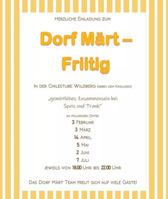 In einer Woche findet wieder unser DorfMärt-Friitig statt. Ein Abend um sich zu treffen, auszutauschen und ein einfaches Essen zu geniessen.