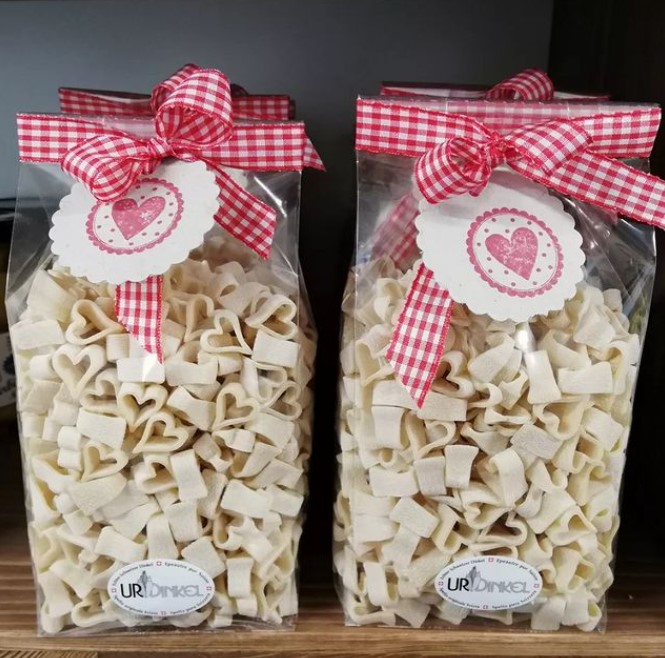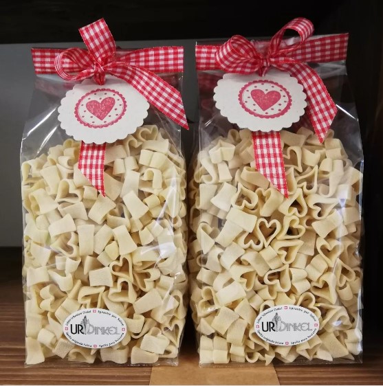 Sie sind eigentlich zu schade zum essen, die hübsch verpackten Dinkel-Härznüdeli vom Aumerhof. Wir freuen uns sehr, dass wir diese neu auch im Angebot haben.