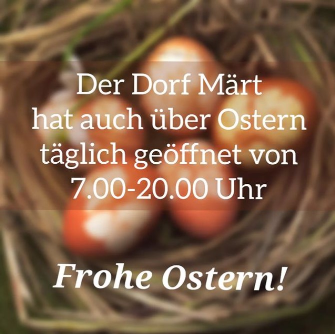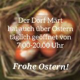 Der Dorf Märt hat auch über Ostern jeden Tag geöffnet von 7.00-20.00 Uhr.