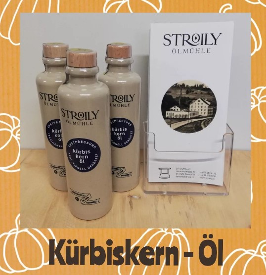 Jetzt ist das feine Kürbiskernöl von Stroily aus Bauma auch bei uns erhältlich. Schon bald wird das Baumnussöl nachgeliefet -> frisch ab Presse!