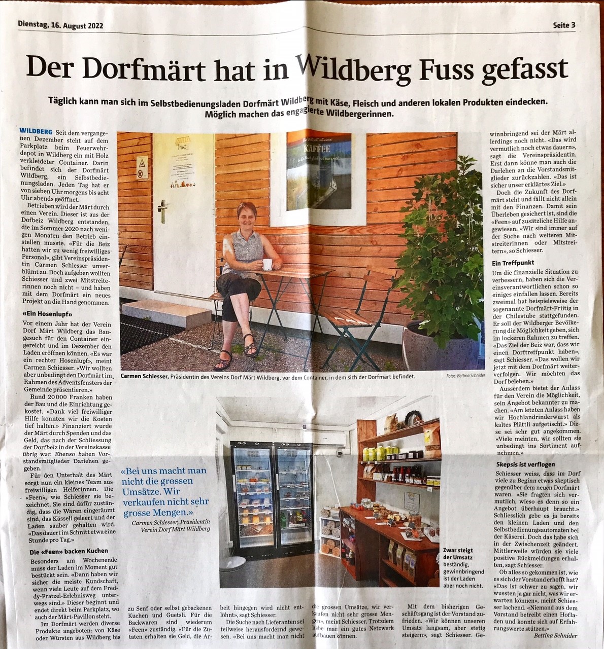 ctschiesser@sunrise.ch052 385 23 65 078 681 00 07 Instagram: dorfmaertwildberg Verein Dorf Märt Wildbergc/o C. SchiesserLuegetenstrasse 198489 Wildberg
